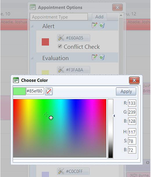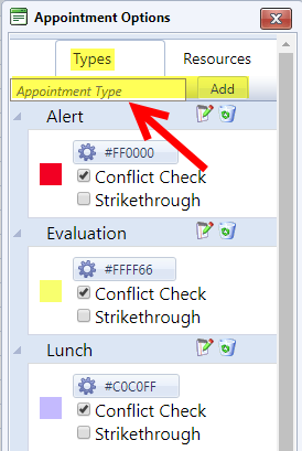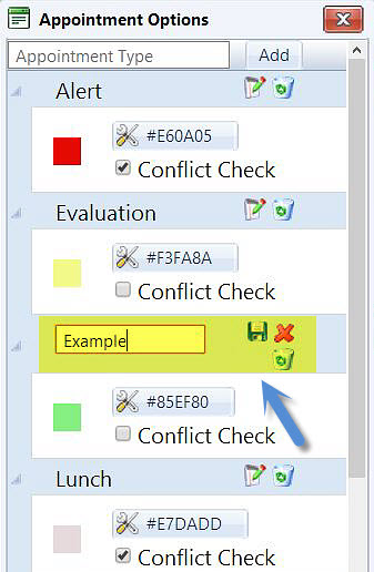Schedule Administrators have the ability to change and edit Appointment Types and Colors, via the Appointment Options button on the toolbar. Only users with administrator privileges will see and have access to Appointment Options.