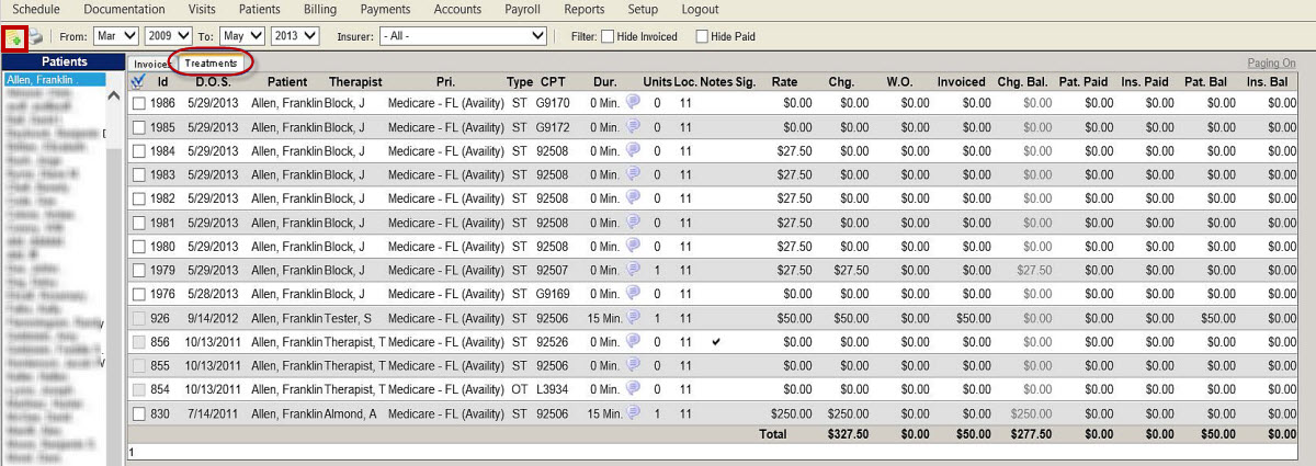 Non-billable treatment line items with G-Codes are invoiced the same way as billable CPT code line items. In the Billing > Treatments tab, select the check box adjacent to the row(s) you wish to invoice and then click the Invoice button. G-Code treatment line items and their associated modifiers will be automatically placed on the invoice along with the billable CPT code line items.