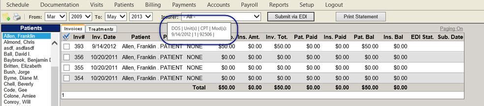 You can quickly review individual dates of service on an invoice by hovering over the list item with your cursor. This will activate a flyover window, which displays the following information at a glance: