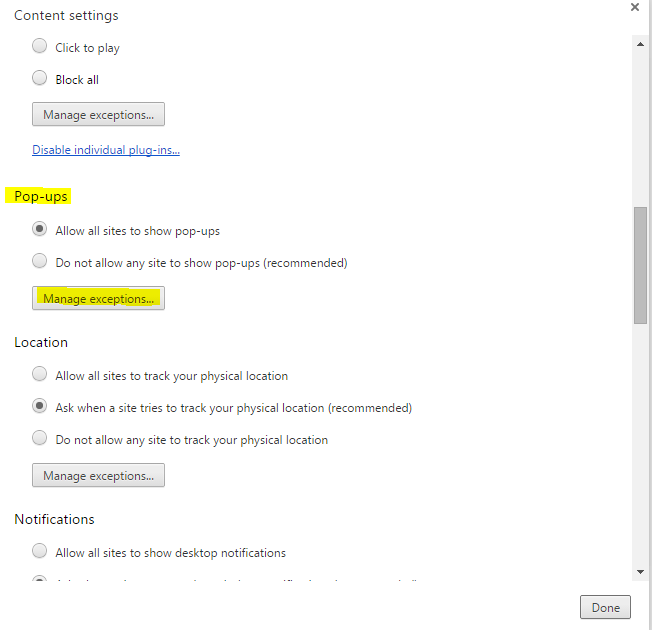 When you see the 2 sites added to the “Pop-up exceptions” section as described above click Done .