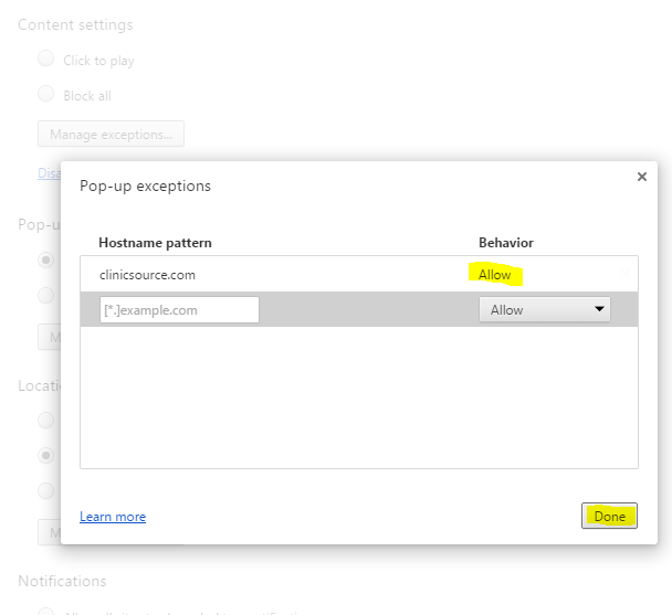 Add the following websites by keying in the sites below, selecting the “Allow” behavior and clicking the Done button: