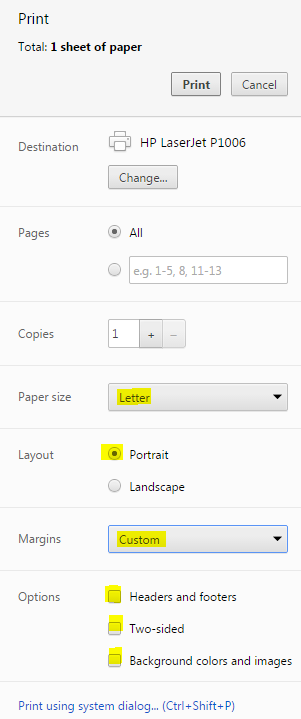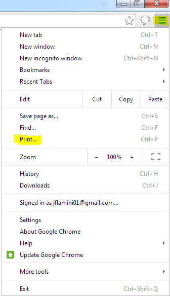 On the Google Chrome Tool bar, click: Customize and control Google Chrome button then select Print.