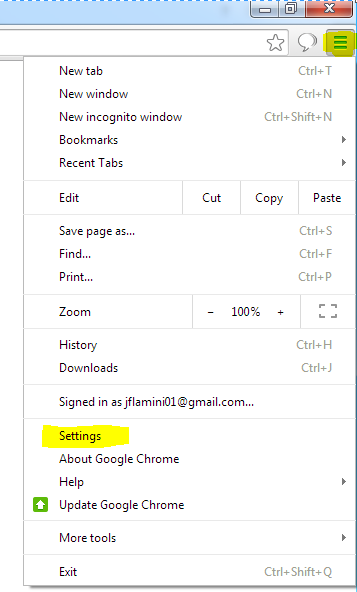On the Google Chrome Tool bar, click: Customize and control Google Chrome button then select Settings