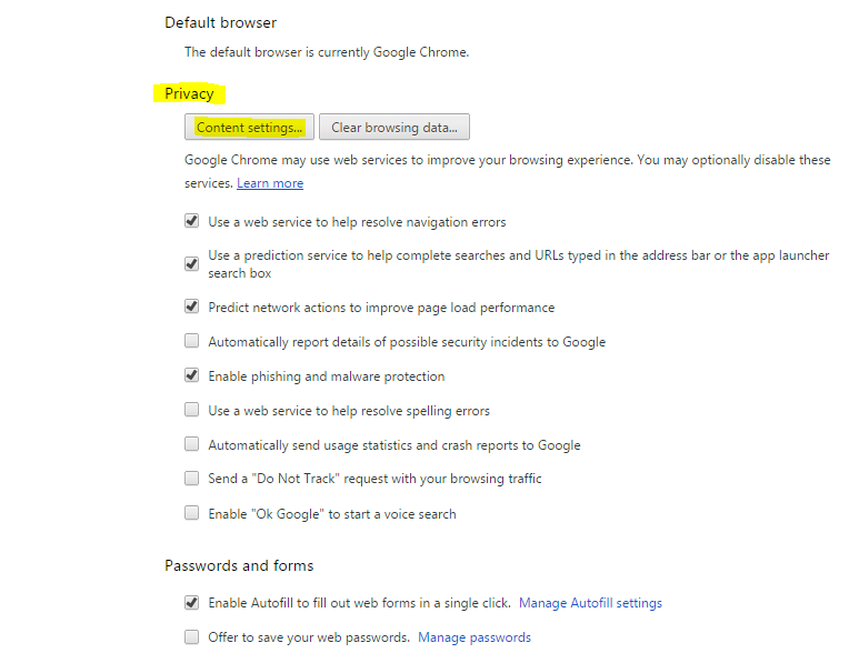 On the Google Chrome Settings popup, scroll down to the Privacy section, Click on: Content settings.