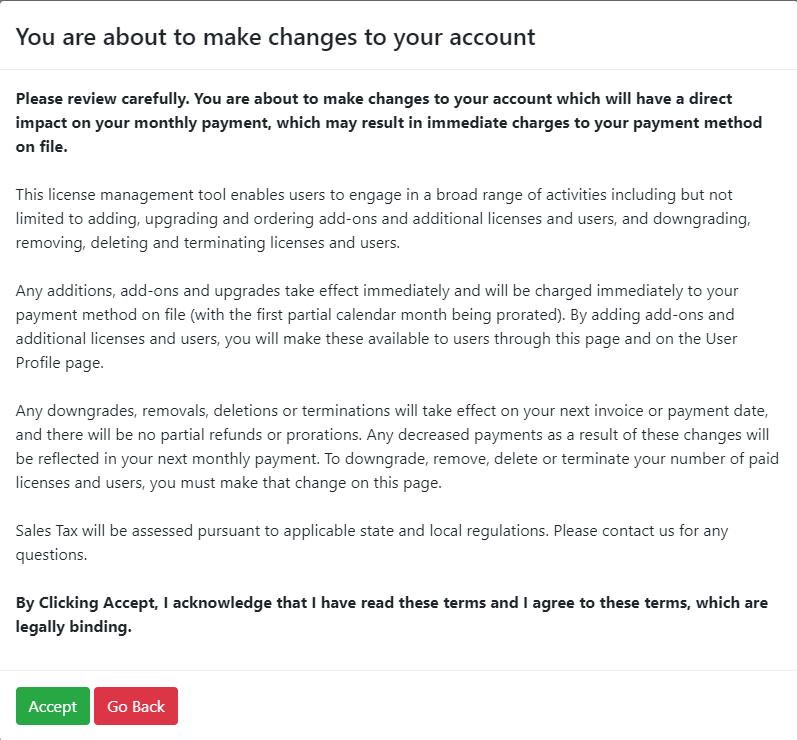 Once License Management is selected, you will see a notification alerting you to the possible implications that you changes may make to your monthly billing: