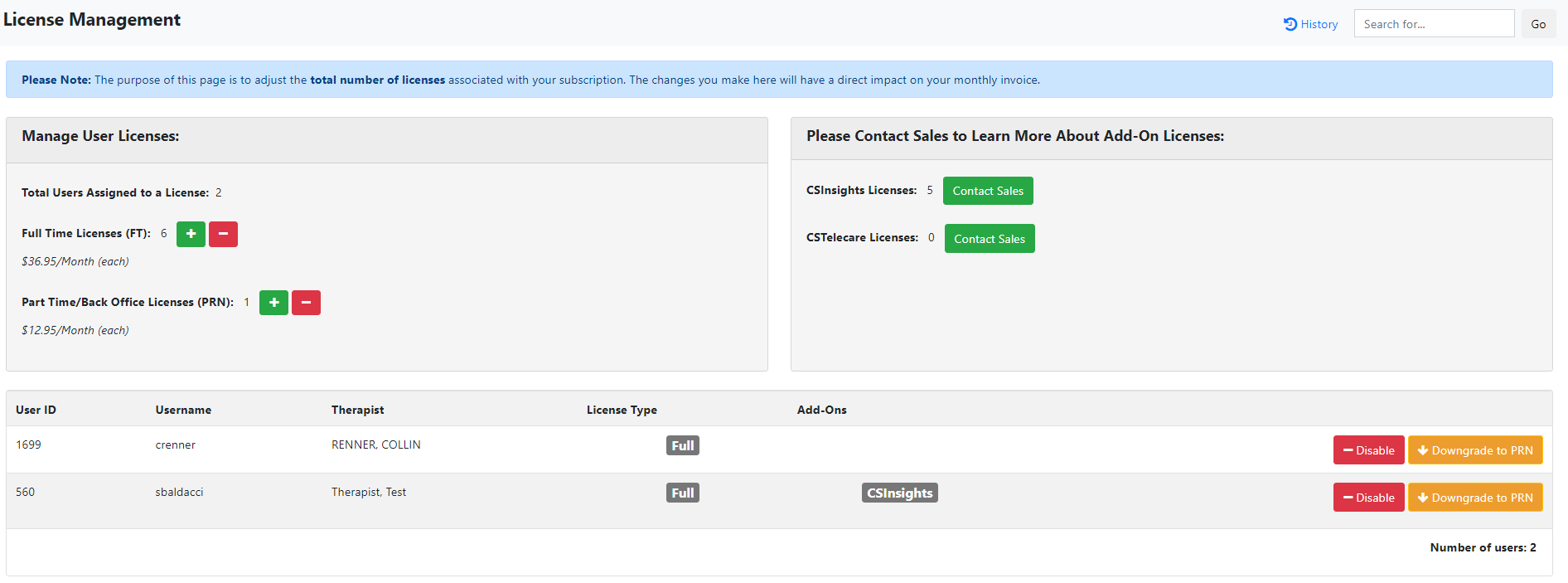 Once you read and accept the information in the disclaimer, you will be directed to the License Management Page. Below is where any additions, subtractions, upgrades, downgrades and enabling or disabling of licenses/users can take place. Once the adjustments are completed, you will see a Submit Changes button as well as a Cancel Button in the upper left. Any additions to licenses will happen immediately and will be available for you to assign to a new user in Setup>Users/Therapists. Any subtractions to user licenses will happen by the end of your current billing cycle.