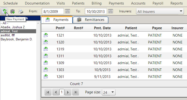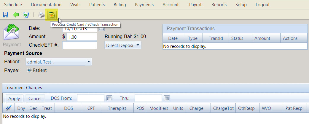 You can process credit card payments from within the Payments page. Begin by selecting a patient name from the Patients menu, then click the New Payment button to create a new payment for the patient.