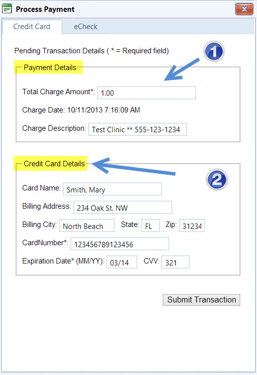 - Review the Pending Transaction Details, noting that an asterisk (*) indicates a required field. Then enter the Payment Details. These fields will be automatically populated with preexisting billing information saved in the Patient record, but if not already populated, you can enter the Total Charge Amount. The Charge Date will appear beneath that. The Charge Description is preset to display your clinic name and telephone number, and can be modified if needed.